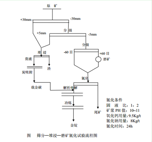 選礦方法:粗顆粒堆浸,細顆粒全泥氰化炭漿法,最后金濕法冶煉工藝流程。
